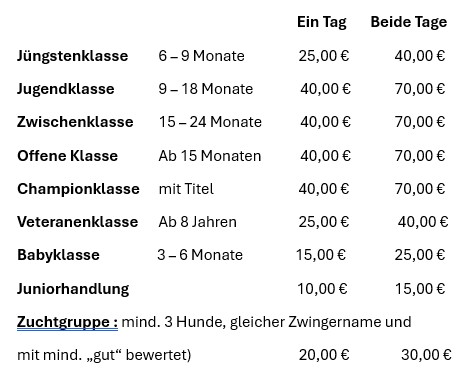 - Zugelassen und in den Katalog aufgenommen werden nur Hunde, die vor dem 11.2025 geworfen wurden – ausgenommen Babyklasse –, für die eine ordnungsgemäße und rechtzeitige Meldung inkl. Meldegebühr vorliegt und die in einem vom VDH und FCI anerkannten Zuchtbuch bzw. Register der Rasse eingetragen sind.